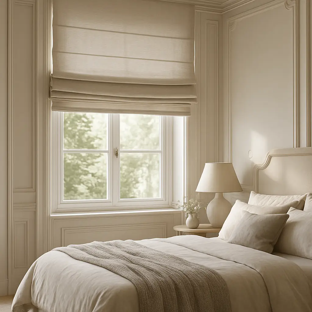 Wybierz jasne, pastelowe kolory i naturalne tkaniny, np. len lub bawełnę. Rolety rzymskie z takiego materiału rozpraszają światło, tworząc miękką, przyjazną aurę.