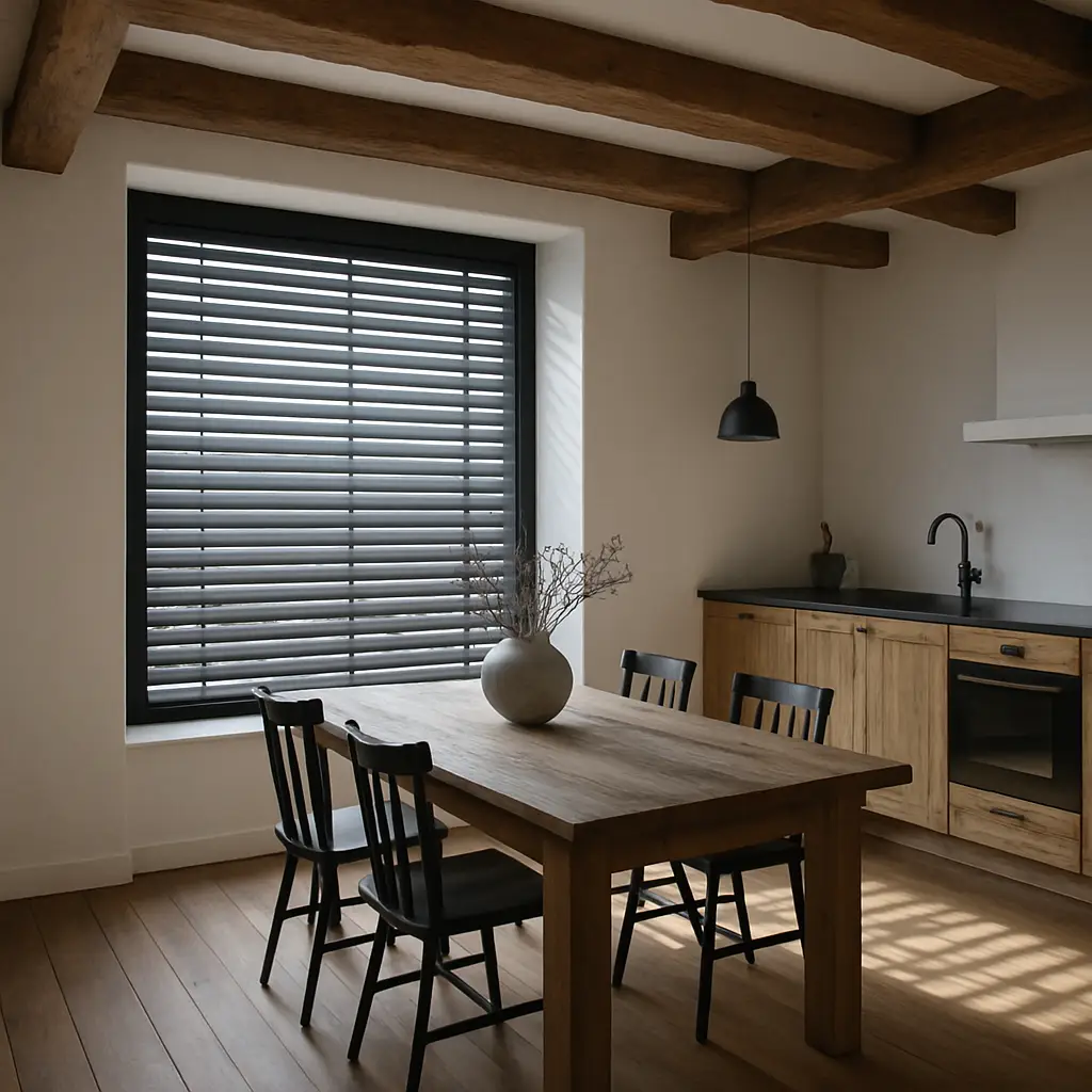 W kuchni liczy się łatwość czyszczenia i odporność na wilgoć. Rozważ żaluzje drewniane z powłoką zabezpieczającą lub shuttersy (okiennice wewnętrzne) wykonane z materiałów odpornych na zmiany temperatury.